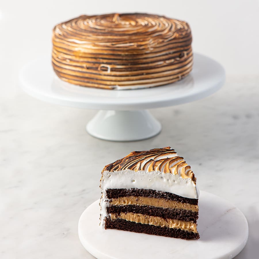 layers of chocolate cake with caramelized buttercream, toasted meringue frosting